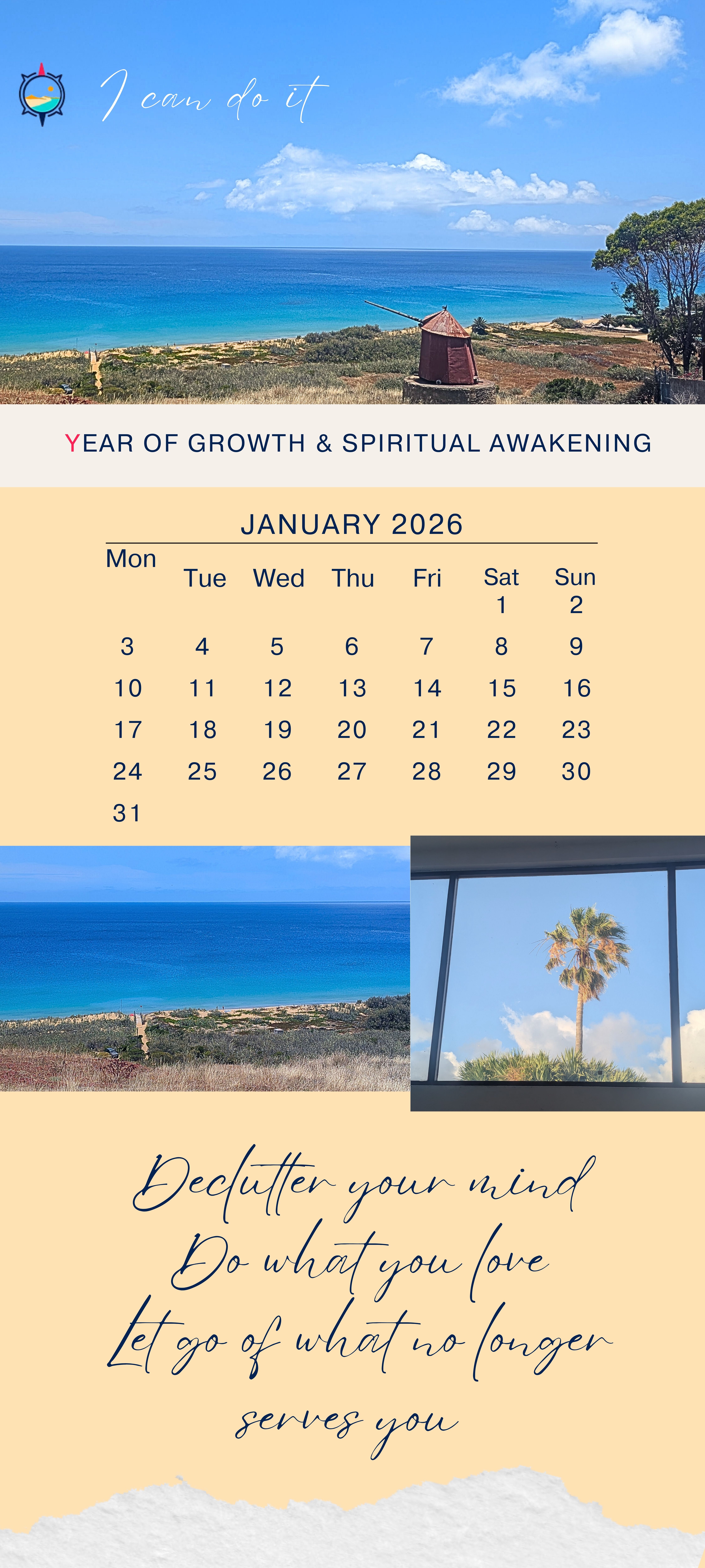 A thoughtfully designed collage combining island landscapes, a clean January 2026 calendar, and positive affirmations—your complete island-inspired moodboard for the month ahead.