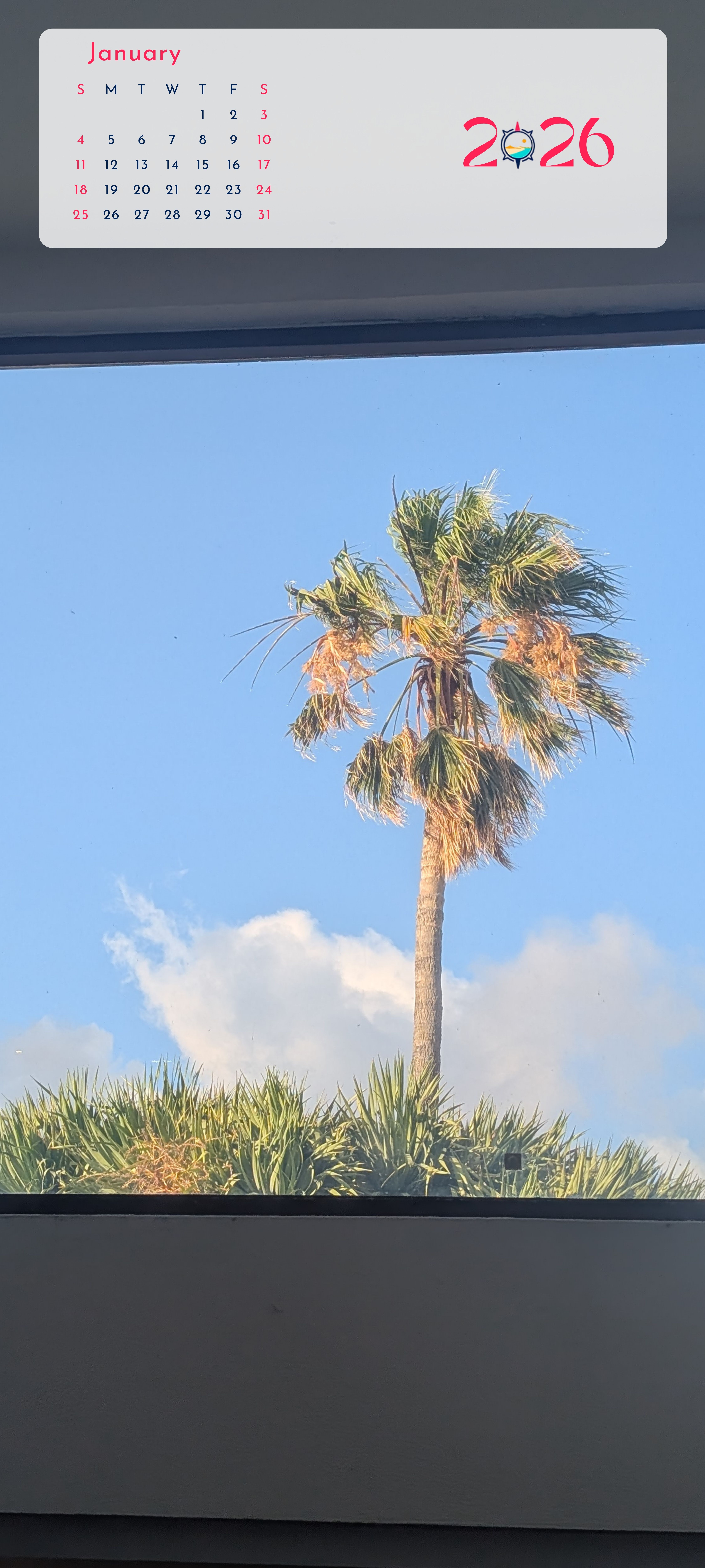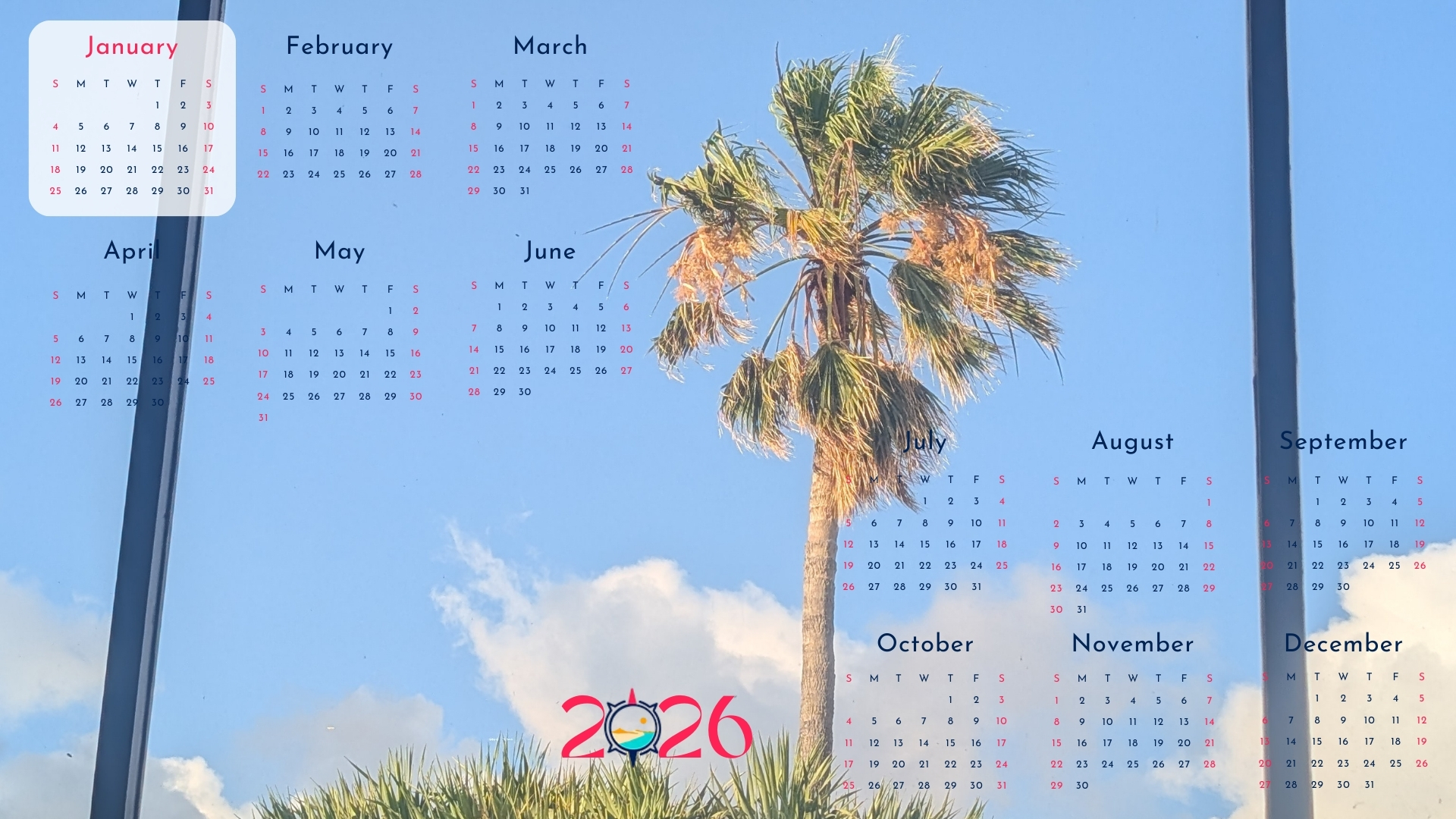 Wake up every day to Porto Santo’s signature calm. This wallpaper captures the iconic palm tree against an endless blue sky, photographed from Hotel Porto Santo Spa. Paired with a clean full-year 2026 calendar, it’s ideal for big-picture planning and intention-setting.
