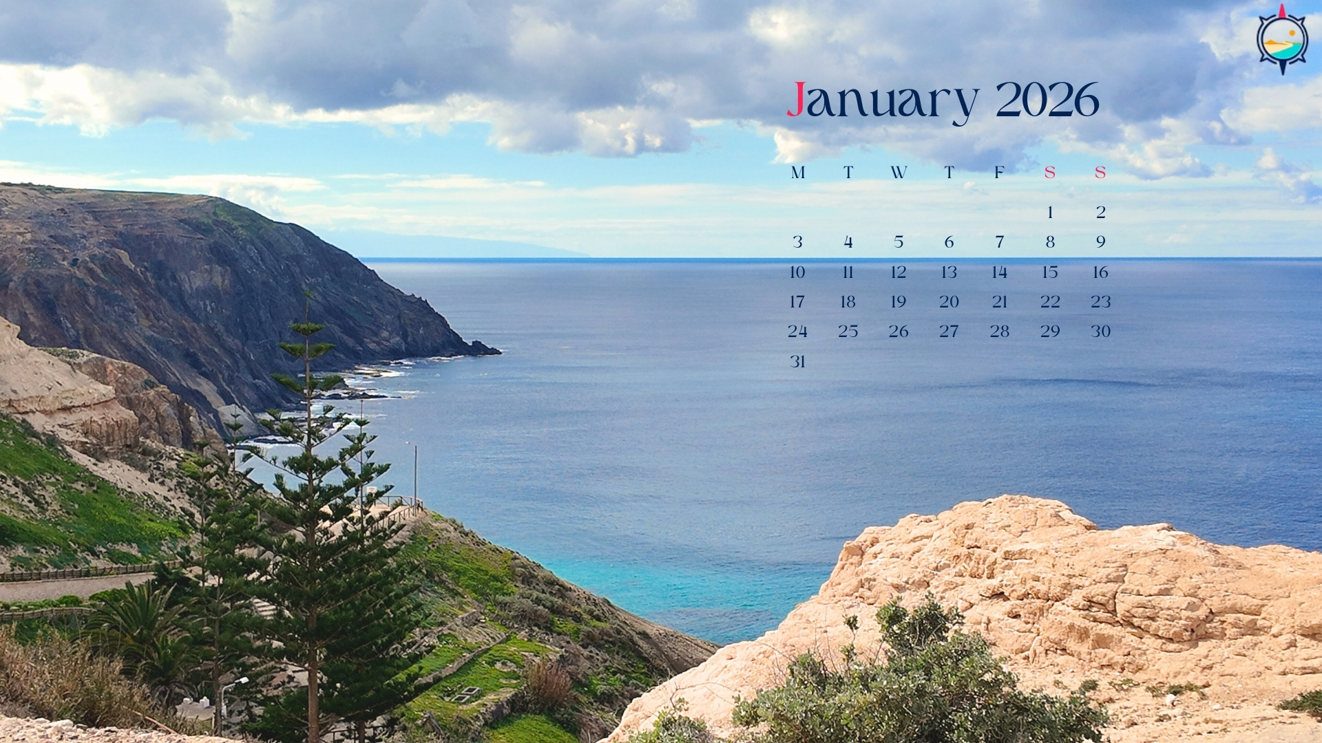 A peaceful coastal scene paired with a minimalist January 2026 calendar layout—perfect for calm, focused screens.